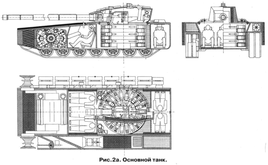 The first heavy vehicle that Losik/Brilev describe is an evolution of a main battletank, with the crew all positioned in the hull. Weight would be around 50-55t. Commander, gunner and driver are located in the forward part of the hull. Two additional crewmen are located in the rear and their duties include operation of two machine-gun armed secondary turrets. A networked control and sensor system could allow any crewmember to operate any of the tank's systems. The additional crew members also offer the potential for the crew to work in shifts during extended operations, two or three crew operating the tank while the others rest.