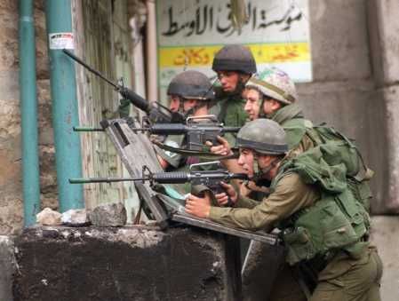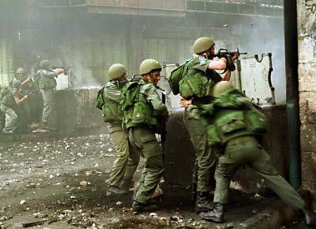 Fire Support Teams will include GPMG crews, platoon mortar crews, sniper teams and the crews of the longer ranged anti-tank/ assault missile systems. Personal body armour will be of a lower level to facilitate the carrying of heavier weapons and ammunition loads. Night vision gear will be mainly weapon-mounted or longer-range handheld or tripod-mounted systems such as ranging/ observation periscopes. Feed from these systems will be networked to the Battle Management section and other platoon elements. A couple of head-mounted systems may be utilized by the team-members tasked with local security. Traditionally Fire Support teams have protected themselves by distance, camouflage and digging in. Time and terrain constraints may prevent this during modern mobile operations. If we consider the Fire Support teams to be the equivalent of the olden archers and slingers we have a hint of a possible solution: the pavise. Israeli infantry have been observed using free-standing shields during urban operations. Rectangular ballistic shields are used by many police departments. Placed on their sides and angled such shields can provide protection to a prone weapon team. Three dimensional camouflage such as netting and parasols will make the exact location of the position harder to determine so the pavis serves as a blind as well as shield. Blast suppressors for machine guns will provide additional hindrance to enemies trying to locate the firing position.(Note extended flash suppressor attachments on the weapons of the Iraelis shown below) Tripod-mounted weapons can also be fitted with angled gunshields of the form already used on vehicle-mounted weapons. Such protection will be supplemented by any additional protection the location offers.