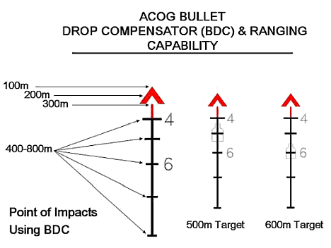 The ACOG reticle incorporates many of the features I have suggested above. I'm a little unsure of the chevron as an aiming point, so have drawn and alternate version (right) using more of the ideas detailed above. This design of reticle would be useful for both ACOG and M68 CCO type sights.