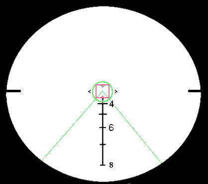 A colour version of the reticle suggestion in my book. Survival Weapons: Optimizing Your Arsenal. Green circle is shoulder width at 200m, red square shoulder width at 300m. Width of rungs are shoulder widths at 400, 500, 600, 700 and 800m, as per ACOG. Apex of green triangle is aimpoint for 200m. Red spike on lower edge of square is aimpoint for 300m. The V on the top edge of the square is for precise shots at 100m. The < and >, vertical sides of the square and bottom corners of the square are used for lead and wind deflection at various ranges as described in the book. | ![]() |