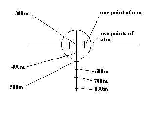 The diameter of the circle is equal to 2ft at 200m, 3ft at 300m and 6ft at 600m, giving a quick and easily remembered method of range estimation. If a standing man appears to fill ¾ of the circle, range is around 800m and the graticule gives an aiming mark with the correct holdover.