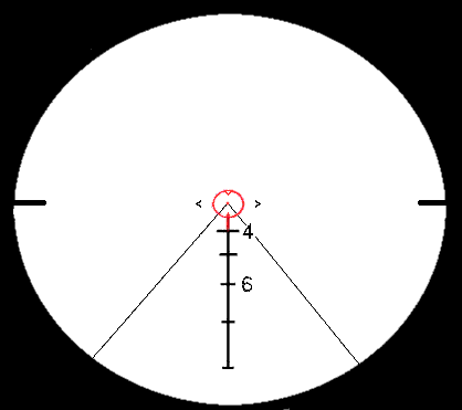 | UPDATE My friend Ed suggested that something like the shotgun sight would also be better for the rifle/LMG sight, since the eye naturally tends to seek the centre of circles. Below is a new suggestion for a graticule based on this idea. Width of the outer circle corresponds to shoulder width at 300m, or 6 MOA diameter. The distance from the ° to the top or bottom of the outer circle is equivalent to the apparent height of a mans head at 300m. A target whose shoulders fit between the ° and one side of the circle would be at 600m, etc. The aiming point for a target at 400m is designated by an inverted V , while those for 500m, 600m and 800m have a 5, 6 or 8 beside them. The 600m aiming mark has brackets the equivalent of 3 MOA apart. This system lets the shooter rapidly assess if the target is within 300m and can be engaged by point blank fire. It also lets the shooter judge if the target is closer or further than 600m. By comparing the target's apparent size to both the outer circle and the 6 bracket he can judge which aiming mark is most suitable. Most of these markings will only be noticeable when the scope is magnifying the image. Viewed x 1 the central design will just look like a red topped lollypop, covering 2" of the target at 30m and 6" at 100m. Inspired by the sights in the Rainbow Six game, I have added what I call pyramid lines to the above design. When shooting with magnification, targeting is a case of putting your target within the circle and placing the point of the arrow/ pyramid where you want the bullet to go. When shooting without magnification at shorter ranges just place the circle/lollypop at the apex of the pyramid on the target. |