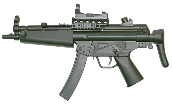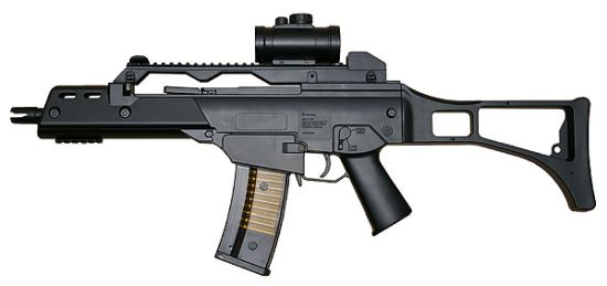 | Another unusual variety of SLR seen used by some AFID personnel is the DSArms SA-58 OSW, a sub-machine gun sized version of the SLR with a folding stock and 11-13” barrel. These are favoured by some AFID Assault/Scout units and some officers. AFID have also acquired a small number of FR Ordnance/ Imperial Defence Services 7.62mm MC51, a submachine gun sized variant of the G3 with a 9.1” barrel. These were probably acquired from other special forces units who have discarded them in favour of other weapons. Although short-barrelled the use of the powerful 7.62x51mm round in the OSW and MC51 gives sufficient power to penetrate 13mm of steel with armour-piercing bullets. |