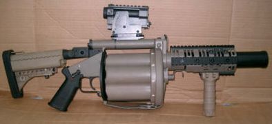 | Milkor M32 Grenade Launcher AFID has a number of 40mm six-shot M32 grenade launchers. HEDP rounds have proved effective against a variety of targets. The main criticism of the weapon is the long arming distance of the grenades. Although the grenades have a casualty radius of around 5 metres the rounds take 14-27 metres to arm, limiting their use during shorter range engagements. The grenadier also carries a variety of other grenade types including smoke, illumination and irritant gas. Many AFID M32 grenadiers prefer to carry smaller weapons such as a MP5 for self‑defence rather than a rifle. | ![]() |