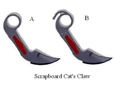 Blade length is about 2. A serrated (Spyder) edge would be appropriate to its cardboard and rope cutting role and I have tried to show this on the version labelled B. There is the option of adding grip panels or a cord wrap and I'd narrow the grip towards the centre to make the tool less of a hinderance if using the hand for something else. The ring pommel allows the tool to be swung out of the way, and there should also be provision for a wrist loop/lanyard. I've shown this on B as two holes, either of which cord could be threaded through. The wrist lanyard also adds the potential for various interesting martial arts moves, such as swinging it by the cord in the manner of a kama or blocking and entangling with the cord stretched between the hands. The variation labelled B also has a Seat belt cutter feature added.