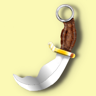 I turned my mind to improving on the idea of "micro-kerambits". The most obvious move is thinner stock material. My other idea was to replace the scales with a D shaped ring, effectively making a one-blade bagh nakh. Jason has mentioned SOE "Tyre-slasher" rings to me. A similar idea, but this would have the ring projectiong to from the side of the blade, to form a "P" when looked down upon. The blade would either project from the fist or be concealed in the hand.