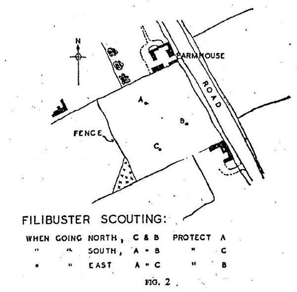 For scouting, my favourite method of progression is the “Filibuster system”, or the “staggered triangle.” This calls for the employment of three men who continuously remain in triangular formation, although their functions may vary from time to time.