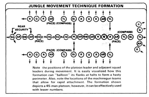 For moving platoon-sized units of men, the jungle formation should be used for tactical environments and the column of route for non-tactical.