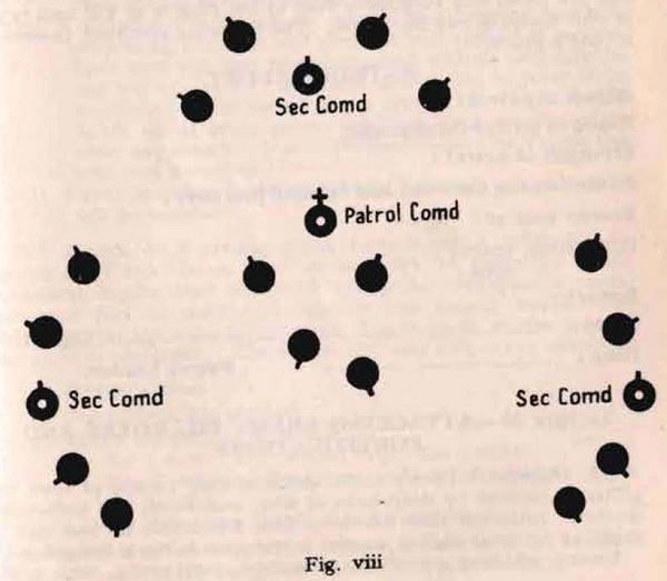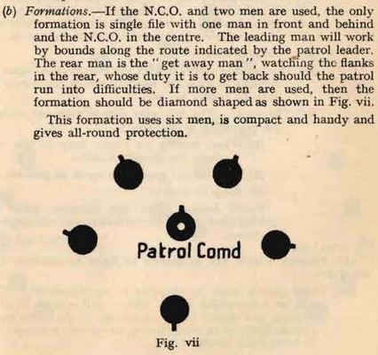 A great many formations have been devised for use by the regular army, some of which fulfil these requirements, but most are unsatisfactory because they are impossible to maintain either for a long distance or in broken country, and very few really ensure the maximum use of available cover. Chiefly for this latter reason S.T.S. do not use the diamond and box shaped formations.”