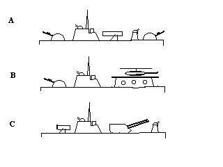 "C" shows a vessel reconfigured for a fire support role in amphibious landings. A long-range T6 155mm gun turret is mounted amidships and the bow gun turret has been replaced with a launcher for E-FOG missiles or a battery of smoke screening rockets. These weapons are used for both direct fire against targets on the beach and indirect fire in support of forces further in shore.