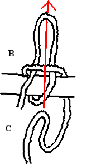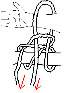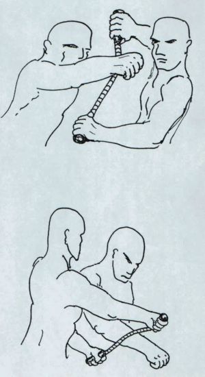 The Up and In Defence.| With a very long weapon such as a sarong or bullwhip the same techniques can be used to bind the arms to the torso. Basically one or both arms are pinned to the body and the other end of the scarf swing in an orbit around the foe. One coil should be applied to the neck to assist in pulling the foe from his feet. The weapon can also be held in both hands and one end moved in a spiral like a gymnast's ribbon. Smaller spirals are made against the limbs to aid control. Once a foe is grounded the weapon may be used to bind him. |