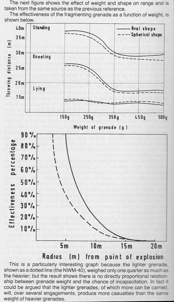 The second graph shows that a certain model of small grenade has only a slightly smaller effect area than another model four times its mass. The smaller variety is identified as a Dutch NWM V-40, which masses only 120 grams, less than half the “optimal” mass the experiments indicate.