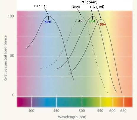 The human eye has three types of cones, and each type is sensitive to a different range of wavelengths. These are know as the red (R), green (G) and blue (B) cones. Alternately they are termed the L, M and S cells to avoid R being confused with the rods.