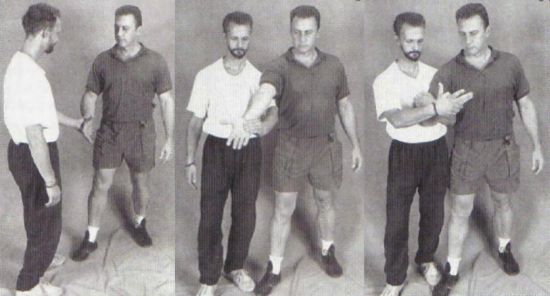 Rex Applegate's book ᾸKill or Get KilledᾹ contained many of the techniques Fairbairn taught and the following photos are reproduced from that source. Again, I have flipped the images to show application against the right arm.