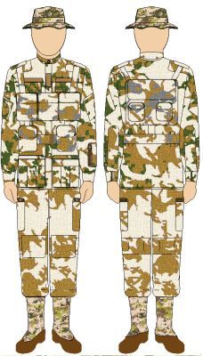 This pattern is based on the proven British two-colour desert DPM. The darker sections have had an even darker green or grey-brown added. The large areas of lightest colour contribute to depth disruption and counter the shading effects of the human shape.