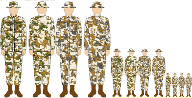 On the far left is a verdant pattern intended for use in summer and jungle conditions. The right pattern, which I call bronze is designed for arid, autumnal and urban environments. A soldier would have a camouflage smock with the verdant pattern on one side and bronze on the other. For desert conditions a smock would have a desert pattern on one side and bronze on the other.