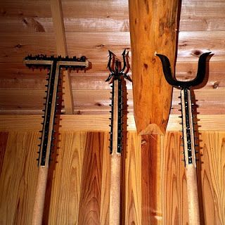 As many readers will no doubt agree, I have some fairly eccentric thought processes. I was watching the TV series Death Valley and began to reflect that if I was regularly being charged by zombies I might want something more physical to stop them while the all important headshot was administered. At first I thought about a quarterstaff or possibly a boarspear but then I recalled a Japanese polearm called the tsukubô. The tsukubo was one of the torimono sandôgu (three implements of arresting) used by feudal Japanese police, along with the sodegarami and sasumata. The tsukubo was a T shaped pole used for pushing, pulling and tripping a suspect. The sodegarami (Sleeve tangler) had an array of hooks and was designed to entangle in the loose clothing worn then. The sasumata was a forked implement intended to catch a limb or the neck. Similar devices to the sasumata were also in use in the west, where they were called mancatchers or catchpoles. Many western examples were more sophisticated with sprung jaws to prevent the body part escaping again once caught. On the right is a modern Japanese sasumata that copies this feature.