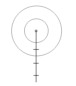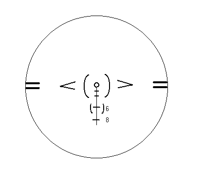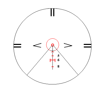 | UPDATE My friend Ed suggested that something like the shotgun sight would also be better for the rifle/LMG sight, since the eye naturally tends to seek the centre of circles. Below is a new suggestion for a graticule based on this idea. Width of the outer circle corresponds to shoulder width at 300m, or 6 MOA diameter. The distance from the ° to the top or bottom of the outer circle is equivalent to the apparent height of a mans head at 300m. A target whose shoulders fit between the ° and one side of the circle would be at 600m, etc. The aiming point for a target at 400m is designated by an inverted V , while those for 500m, 600m and 800m have a 5, 6 or 8 beside them. The 600m aiming mark has brackets the equivalent of 3 MOA apart. This system lets the shooter rapidly assess if the target is within 300m and can be engaged by point blank fire. It also lets the shooter judge if the target is closer or further than 600m. By comparing the target's apparent size to both the outer circle and the 6 bracket he can judge which aiming mark is most suitable. Most of these markings will only be noticeable when the scope is magnifying the image. Viewed x 1 the central design will just look like a red topped lollypop, covering 2" of the target at 30m and 6" at 100m. Inspired by the sights in the Rainbow Six game, I have added what I call pyramid lines to the above design. When shooting with magnification, targeting is a case of putting your target within the circle and placing the point of the arrow/ pyramid where you want the bullet to go. When shooting without magnification at shorter ranges just place the circle/lollypop at the apex of the pyramid on the target. |