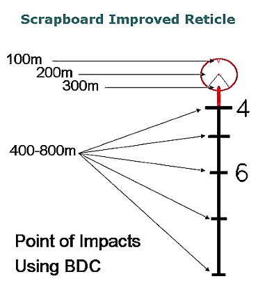 The ACOG reticle incorporates many of the features I have suggested above. I'm a little unsure of the chevron as an aiming point, so have drawn and alternate version (right) using more of the ideas detailed above. This design of reticle would be useful for both ACOG and M68 CCO type sights.