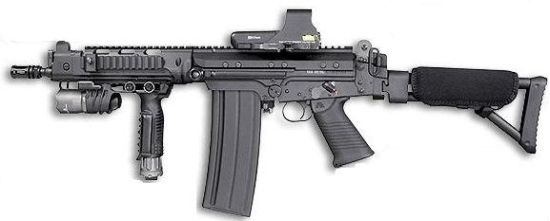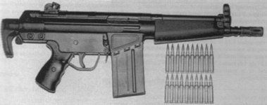 | Another unusual variety of SLR seen used by some AFID personnel is the DSArms SA-58 OSW, a sub-machine gun sized version of the SLR with a folding stock and 11-13” barrel. These are favoured by some AFID Assault/Scout units and some officers. AFID have also acquired a small number of FR Ordnance/ Imperial Defence Services 7.62mm MC51, a submachine gun sized variant of the G3 with a 9.1” barrel. These were probably acquired from other special forces units who have discarded them in favour of other weapons. Although short-barrelled the use of the powerful 7.62x51mm round in the OSW and MC51 gives sufficient power to penetrate 13mm of steel with armour-piercing bullets. |