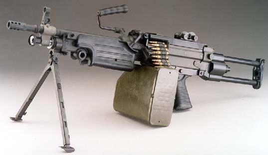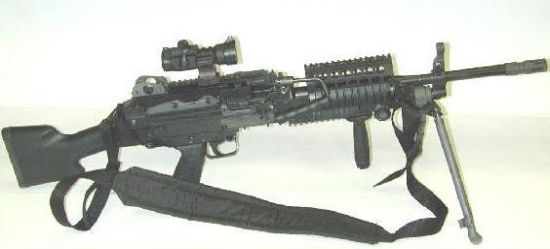 Minimi-Para L110A1/M249The second most common weapon used by AFID is the Minimi-Para L110A1 machine gun. This is a relatively light belt-fed weapon firing the 5.56x45mm round. AFID use the “Para” model, which has a folding stock, 13.75” barrel and weights around 15.5 lbs. While the barrel length is a little short to get optimum performance from the round this is somewhat compensated by the high volume of accurate fire the weapon can produce. AFID units field large numbers of these weapons. An AFID unit may have 30-50% of its force carrying L110A1s, with the majority of the rest carrying 7.62mm battle rifles. |