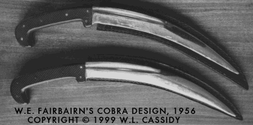 One of the few double edged curved fighting knives to gain some recognition in the west was Round Eye Tool's Hobbit (right). This, to my mind, was the wrong way around, and should have put the serrations on the convex side. All the pictures that I've seen of the Hobbit in use have had it held ice-pick fashion in the comic-book convex edge forward style. Suppose instead it was held point forward and had the convex edge serrated? Such a weapon could be used like a keramabit. When performing backhand strikes the serrations would "bite" and counter any tendency of the convex edge to glance off.
