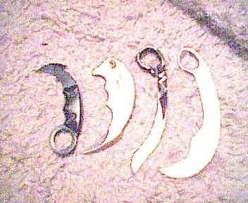 I turned my mind to improving on the idea of "micro-kerambits". The most obvious move is thinner stock material. My other idea was to replace the scales with a D shaped ring, effectively making a one-blade bagh nakh. Jason has mentioned SOE "Tyre-slasher" rings to me. A similar idea, but this would have the ring projectiong to from the side of the blade, to form a "P" when looked down upon. The blade would either project from the fist or be concealed in the hand.