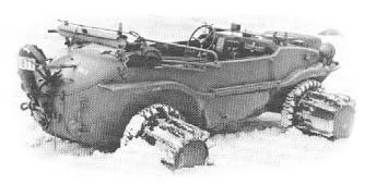 One interesting thing I've come across researching this topic are wheel fittings for the Schwimmwagen that are called Walzen, which I think translates as roller. These might be paddles to supplement the vehicle's propeller, or they might be a device for spreading the weight on soft ground, or a combination of both.