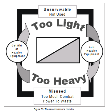 “Since 1914, the light-heavy debate has dominated thought on the organization and employment of reconnaissance forces. However, the debate creates a paradox (figure 63) that has kept it alive since World War II. If the forces are too light and, while stealthy, not survivable on the battlefield, or so perceived, commanders tend to use other units for reconnaissance operations. Usually, the choice of a replacement reconnaissance unit has been whatever element is the lead unit in the movement. This has been particularly true in operations with a high operational tempo. Most US Army conventional operations since 1970 have been such maneuvers.