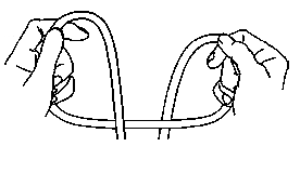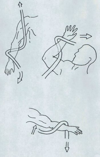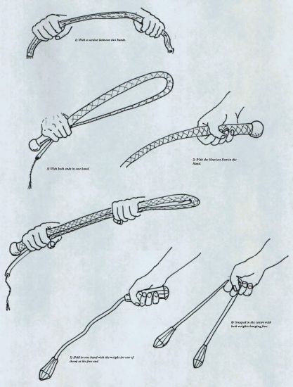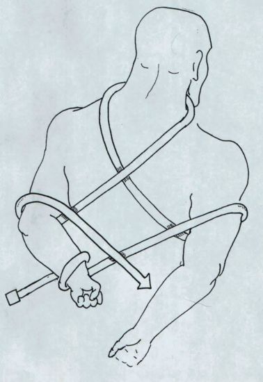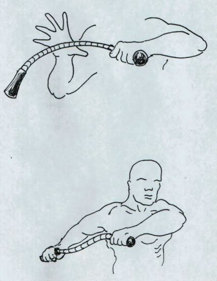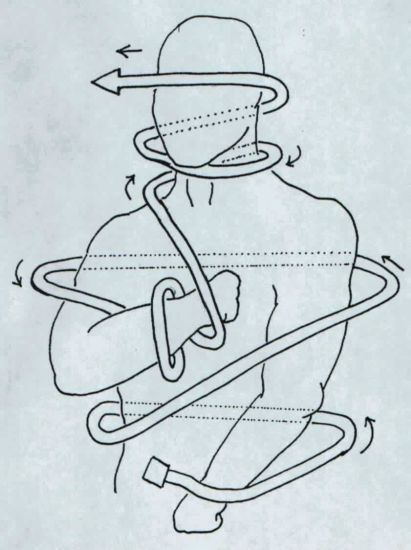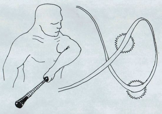The Up and In Defence.| With a very long weapon such as a sarong or bullwhip the same techniques can be used to bind the arms to the torso. Basically one or both arms are pinned to the body and the other end of the scarf swing in an orbit around the foe. One coil should be applied to the neck to assist in pulling the foe from his feet. The weapon can also be held in both hands and one end moved in a spiral like a gymnast's ribbon. Smaller spirals are made against the limbs to aid control. Once a foe is grounded the weapon may be used to bind him. |