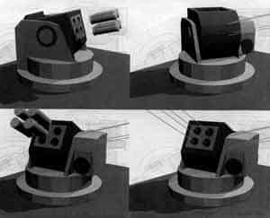 On top of the turret will be a reloadable grenade discharger such as the Thales Reactor (right). This provides 360° coverage and may have both defensive and offensive applications. The system will have between six and nine barrels and be ready loaded with a selection of smoke, flare, chaff, decoy and fragmentation grenades.The French Ruggieri DPEC Spider system has five-barreled firing units, each barrel loaded with a pair of 40mm grenades. These grenades are preset to explode at ranges of between 11 and 44 metres, giving each firing unit a coverage of 2,600 square metres over a 120° arc out to 50m range.