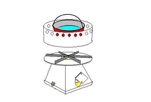 My initial idea is to use something like a cake tin to make the stove body and to use the lid as the base. When using an auxiliary fuel the burner or hearth is placed in the middle of the base and lit, the secondary windshield facilitating this. The stove body is then placed over the heat source.