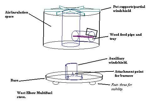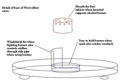 There are two main changes that create the West Elbow stove. The first is that the vertical pipe is open at both ends, and extends down to the baseplate. The second is that there is a detachable baseplate which has provision for securing a spirit burner, hexamine hearth or pot of alcohol in much the same way as the West Mk 1.